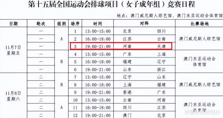 全运会女排比赛详细赛程在近日出炉,第一天比赛就迎来重头戏。卫冕冠军天津女排将和朱婷领军的河南女排交手。李盈莹大战朱婷,毫无疑问将是一大看点。这场比赛也特意被安排在了当天的黄金时间19点开打。